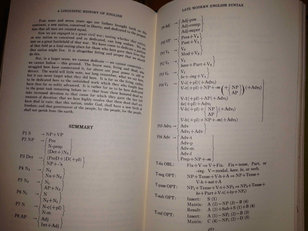 Primjenom sličnih (i mnogo složenijih) produkcija nastaju i sve druge rečenice. Skupom produkcija možemo potpuno opisati svaki jezik i obuhvatiti sve njegove finese. Evo isječka početnih stranica jednog takvog pokušaja za engleski. (Tko će to napraviti za hrvatski? Izgleda da moraju matematičari.)